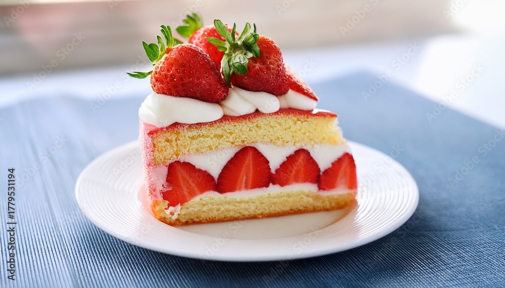 slice of strawberry cake with cream and fresh strawberries on top sits on a white plate dessert delicious fresh sweet treat whipped cream #1779531194