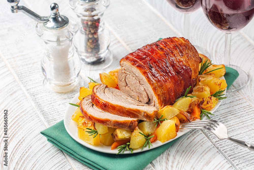 Sliced veal roulade with baked potato and rosemary. Red wine glasses on a white wooden table. Selective focus. #455665162