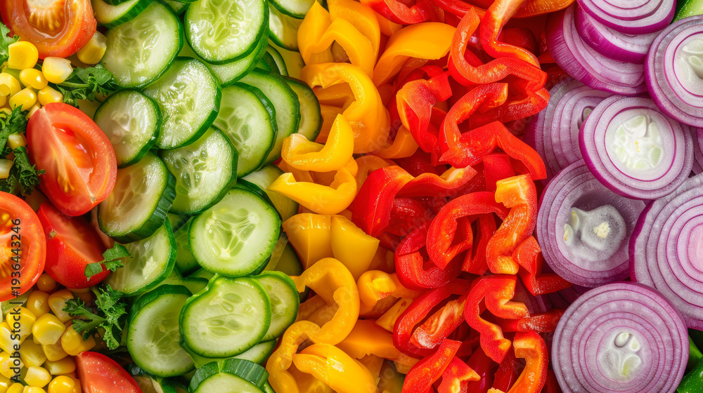 Sliced ​​vegetables: tomatoes, cucumbers, red onions, bell peppers, green parsley, corn kernels. Is cutting for salad. Neatly arranged, with background of natural, healthy vegetarian ingredients #1936443246