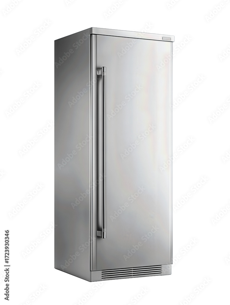 Slim stainless refrigerator with single door and brushed finish, isolated on transparent background. #1723930346