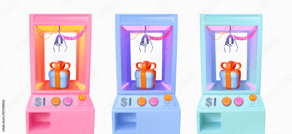 Slot machine elevator machine for getting toys, gifts and prizes. Set of 3 bright neon grab machines. 3d realistic illustration. Vector #1073988026