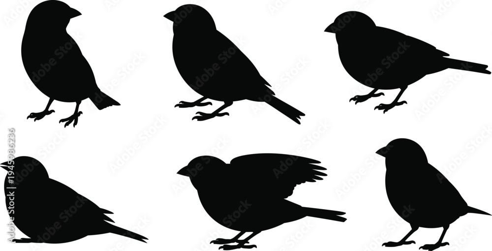 Small bird silhouettes vector set, standing songbirds collection wildlife nature black bird shapes isolated design, flat vector illustration #1945986236