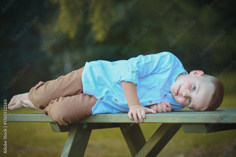 Small boy dressed in shirt posing on bench in summer camp #1765532560