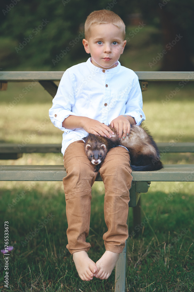 Small boy dressed in shirt posing on bench with ferret in summer camp #1765533673