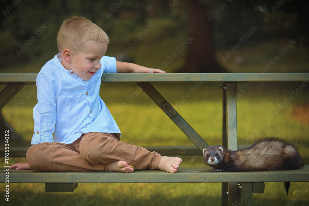Small boy dressed in shirt posing on bench with ferret in summer camp #1765534082