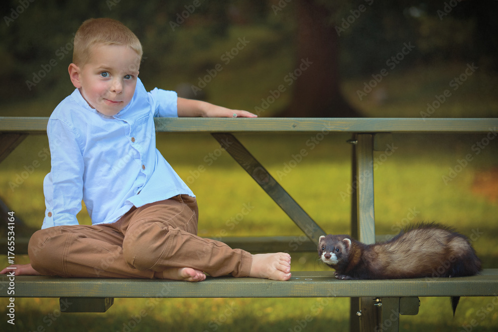 Small boy dressed in shirt posing on bench with ferret in summer camp #1765534164