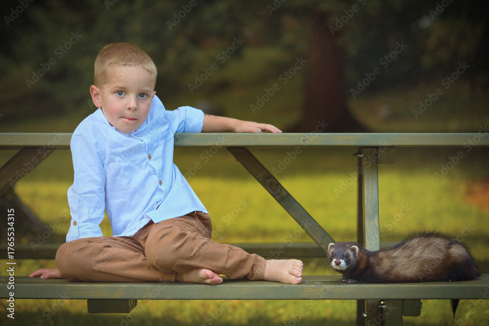 Small boy dressed in shirt posing on bench with ferret in summer camp #1765534315