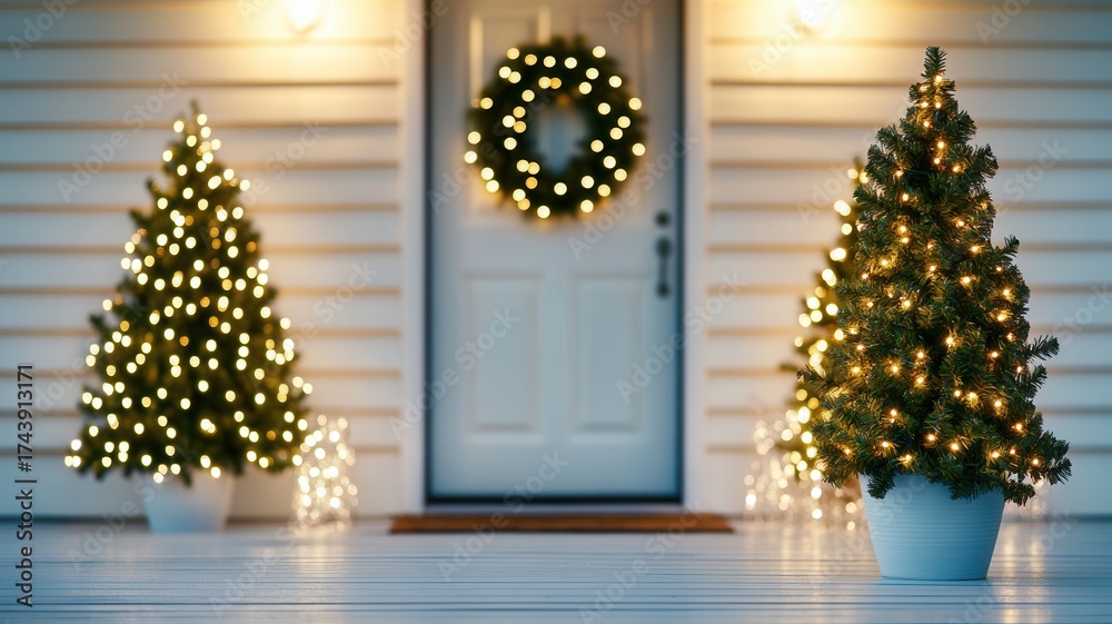 Small christmas trees with lights decorating a porch at night with a blurred christmas wreath hanging on the front door #1743913171