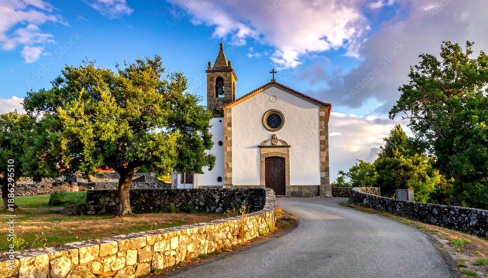 Small church with bell tower along paved road surrounded by trees and stone walls under a blue, cloudy sky #1886295510