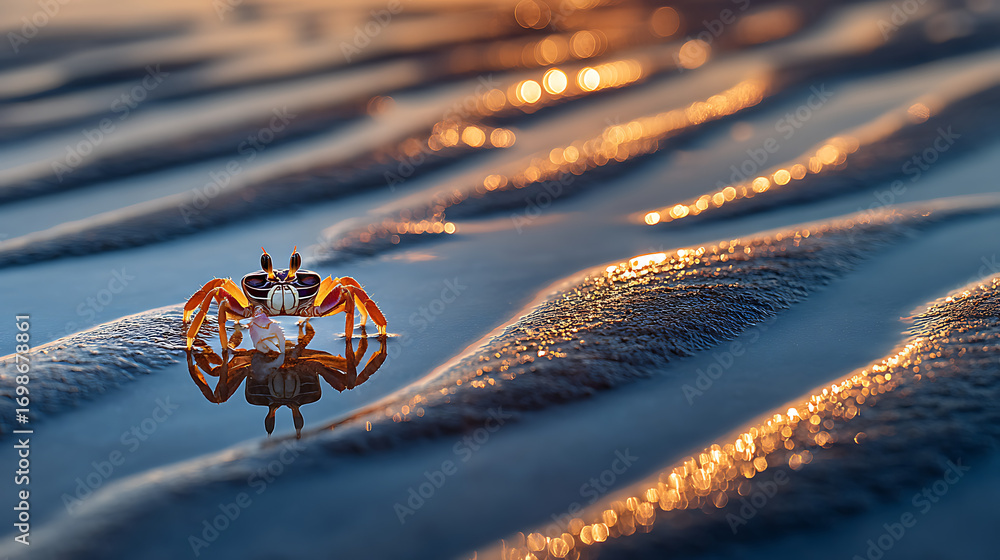 small crab walking on wet beach sand rippled with golden sunlight reflection in serene coastal tropical setting ocean seascape marine wildlife environment habitat nature #1698678861