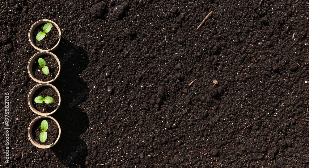 Small green seedlings growing in biodegradable pots on dark soil #1975882786
