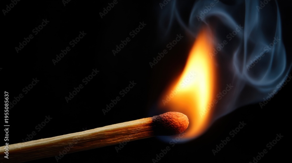 Small match flame ignites in darkness with smoke rising in deep black background #1955085637