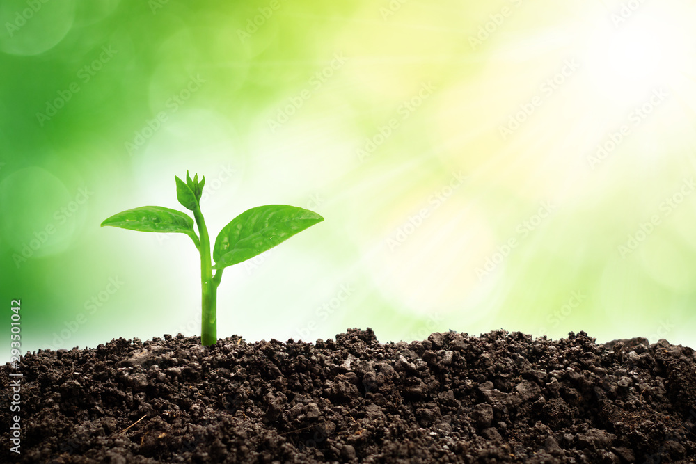 Small trees are growing in the light of the morning sun with natural green background. The concept of love the world. #293501042