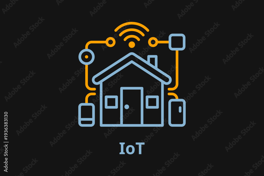 Smart home automation system icon with IoT text, internet of things concept with house and connected devices on dark background. #1936383130