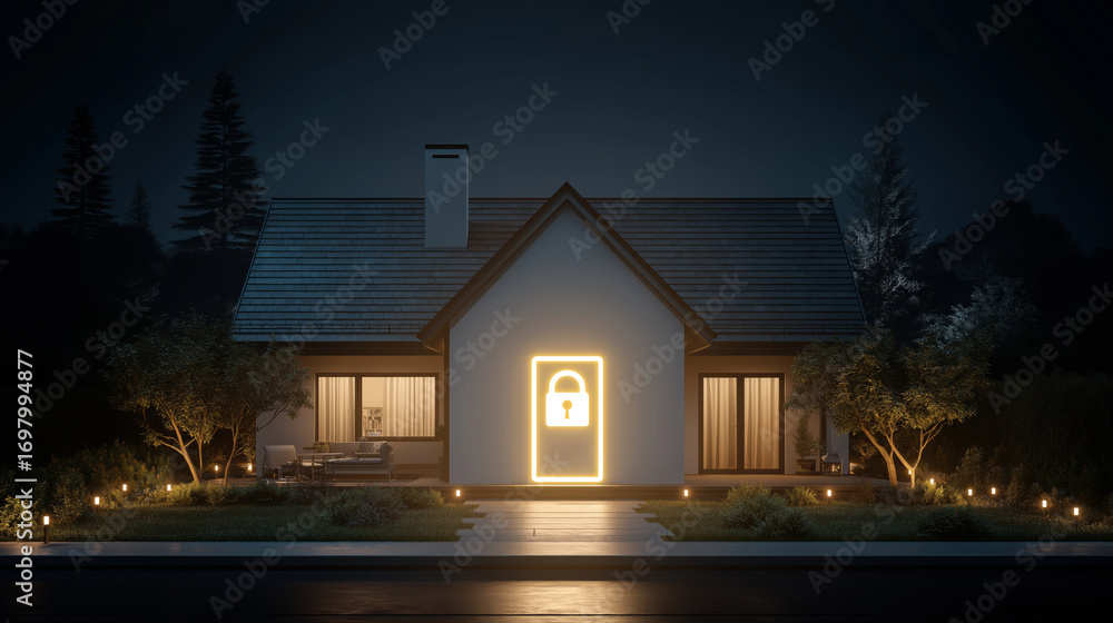 Smart home system with glowing padlock icon projected on wall, secure IoT technology concept. #1697994877