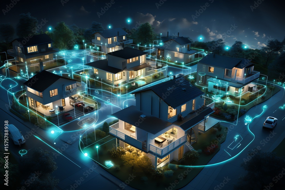 Smart homes connected in a residential area at night. #1575788938