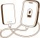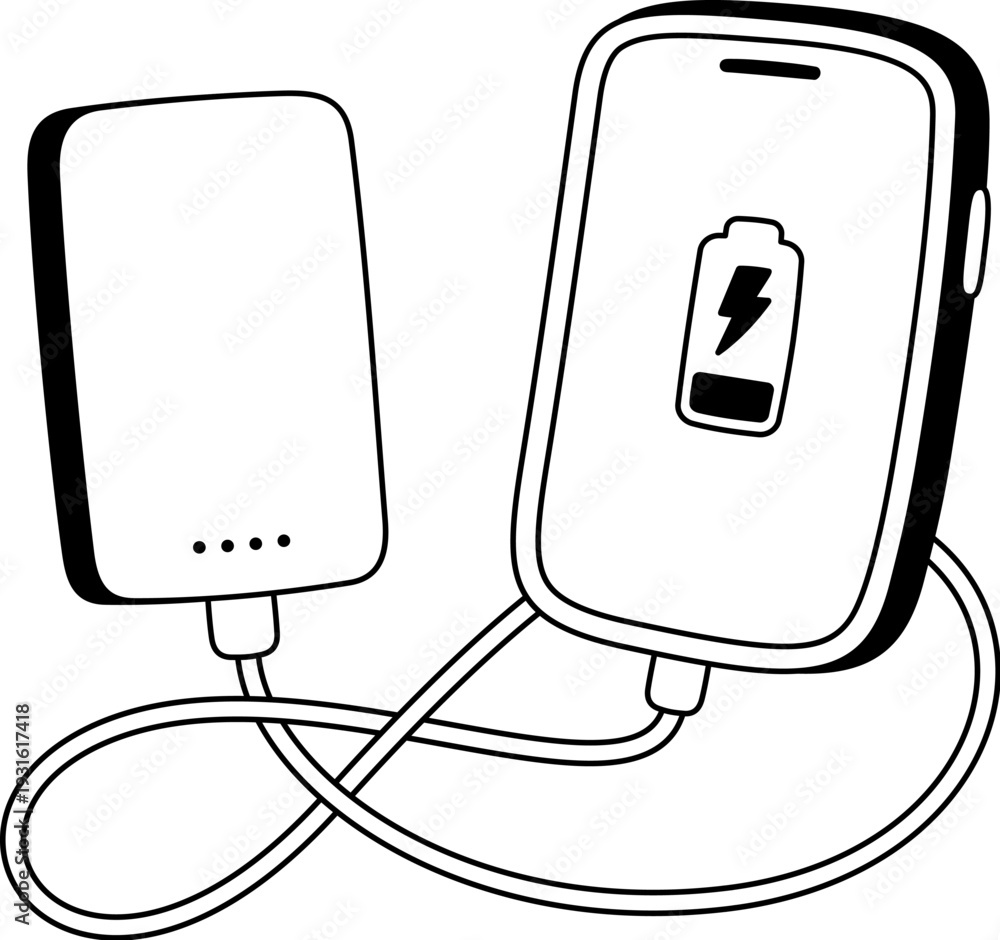 Smartphone charging from a portable power bank. Cute cartoon illustration of phone battery charger. Simple hand drawn black and white vector doodle. #1931617418