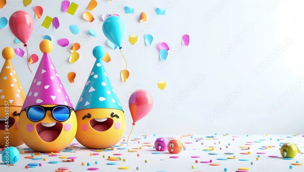 Smile greeting card with party hat and sunglasses emoji face. Happy birthday greeting with 3d smile character copy space for text #841630357