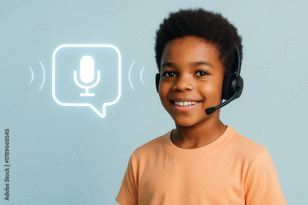 Smiling African American boy wearing headset with microphone symbolizing digital communication #1789660545