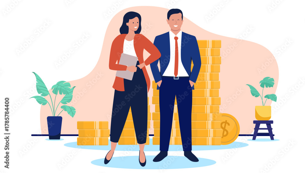 Smiling business man and woman making money standing together in front of piles of gold coins, symbolising financial success, wealth, and investment in a flat design vector illustration #1785784400