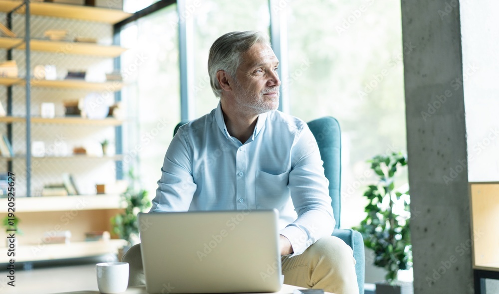 Smiling businessman sitting in office lobby working on laptop. Male business professional working in office lobby #1920525627