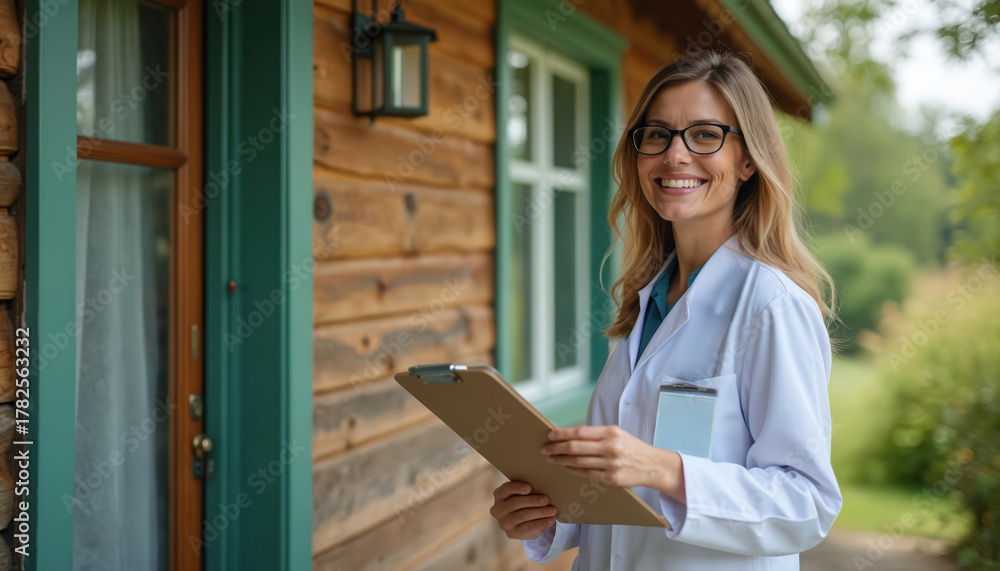 Smiling doctor in lab coat with clipboard arrives at rustic wooden house for home visit. Medical pro ready for house call in countryside setting. Woman cares for patient. #1782563232