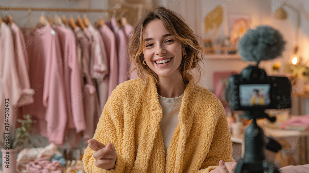 • #1947318472 smiling female seller showing stylish clothes during live stream on social media creating engaging online shopping experience for customers in home retail business