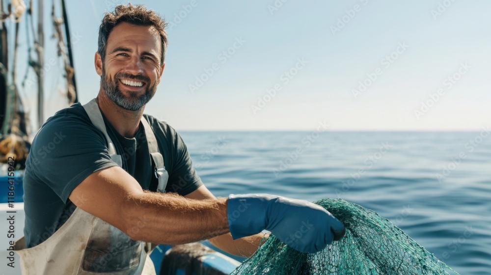 Smiling Fisherman: A happy fisherman on his boat, mending his fishing net and looking directly at the camera. The vast ocean stretches behind him, under a bright sunny sky. #1186415942