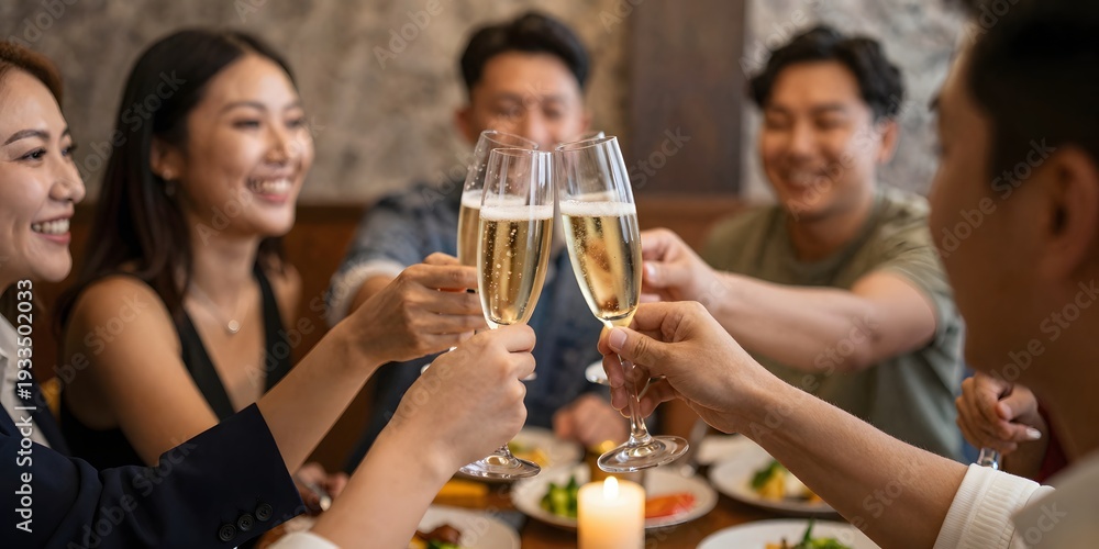 Smiling friends toasting with champagne flutes at a celebratory dinner in a restaurant #1933502033
