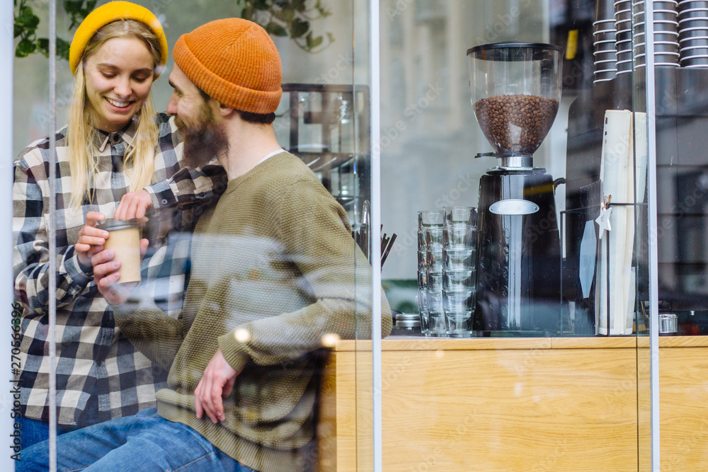 Smiling hipster couple in cafe, having a great time together, view through cafe window, romantic couple having fun together, best friends smiling sitting in cafe, view through cafe window. Copy space #270566396