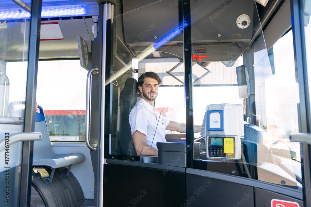 Smiling male bus driver sitting at the steering wheel in his cabin, providing public transport service #1771467033