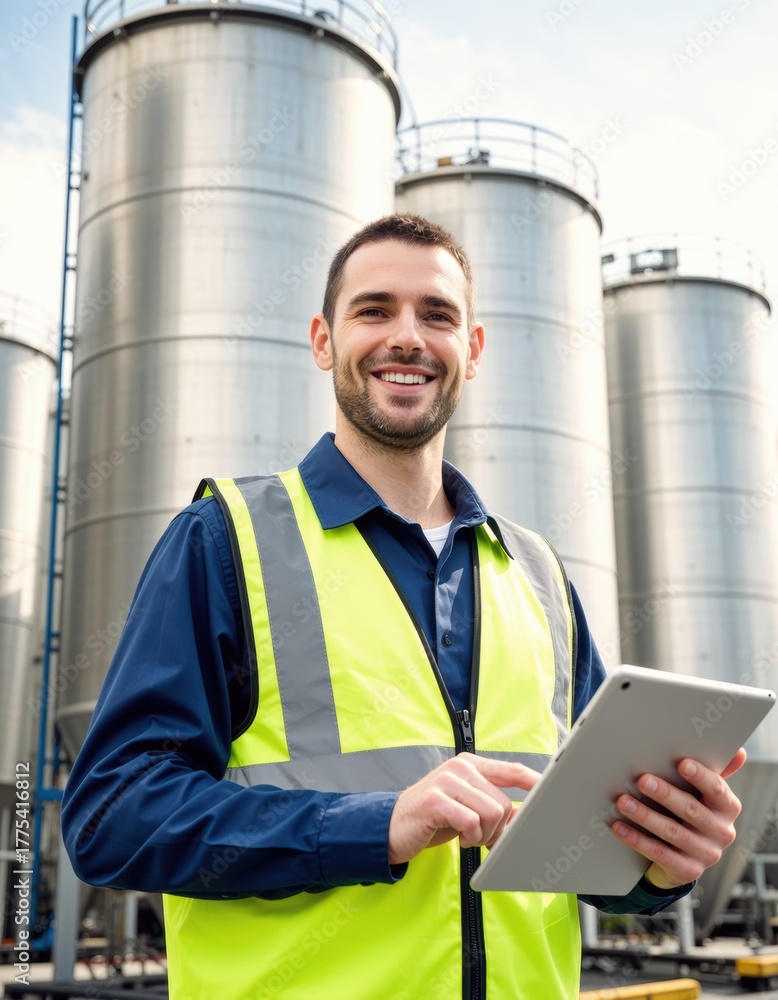Smiling man in a safety vest using a tablet at an industrial site #1775416812