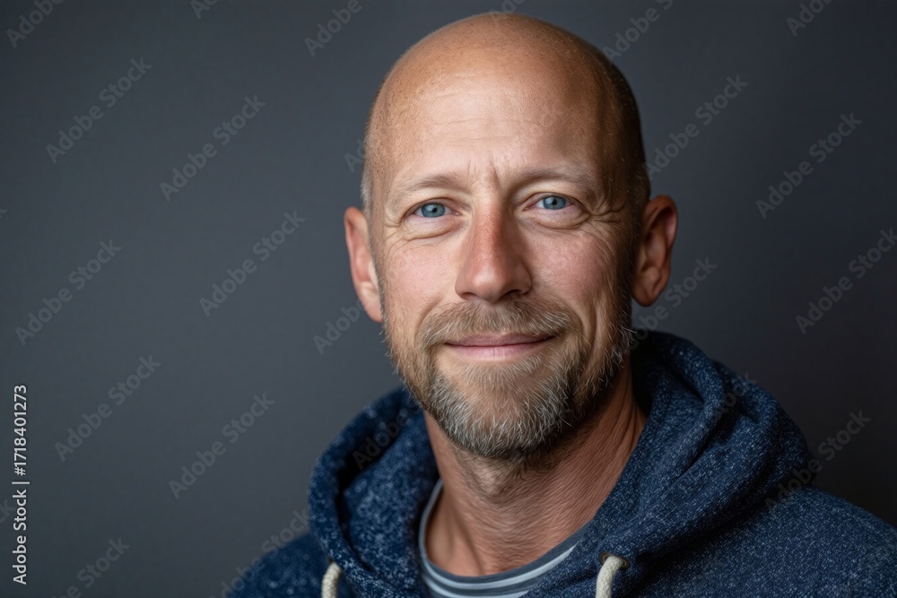 Smiling man with short hair and beard wearing a blue hoodie in studio setting Generative AI #1718401273