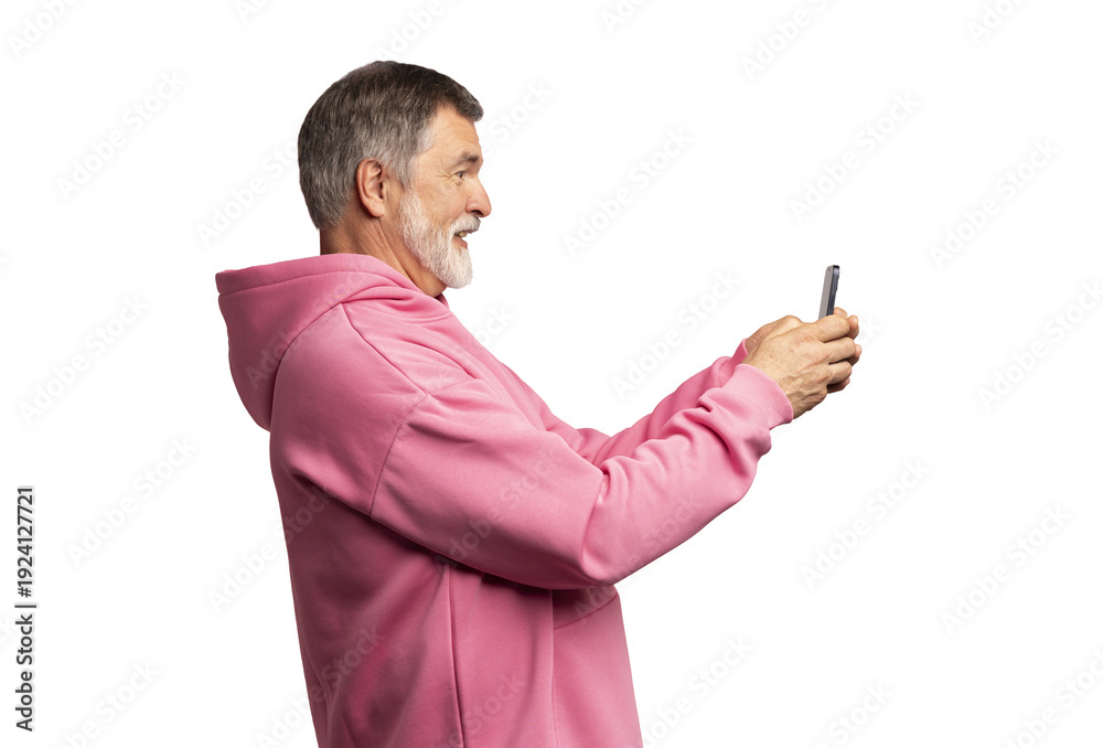 Smiling mature man wearing pink sweatshirt looking at smartphone, isolated on transparent #1924127721