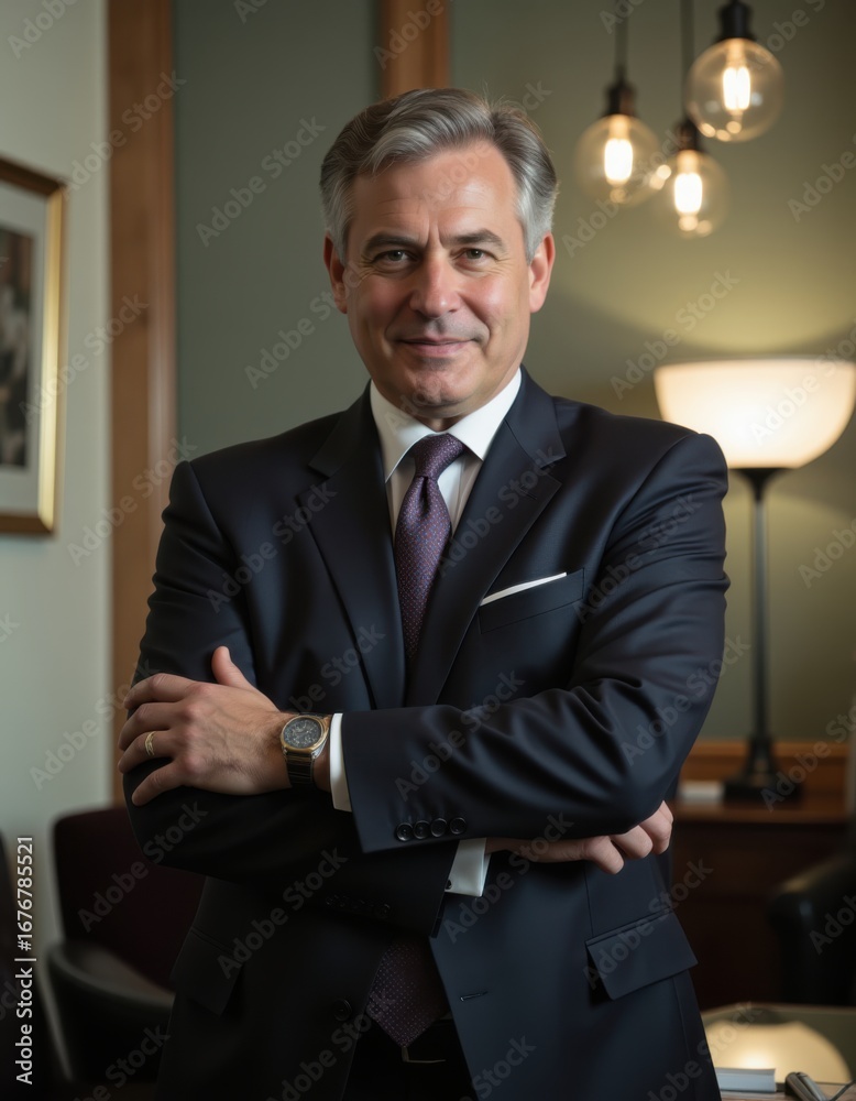 Smiling middle aged ceo business man looking at camera portrait confident happy mature older professional businessman executive manager successful lawyer in suit standing arms crossed in office Pr #1676785521
