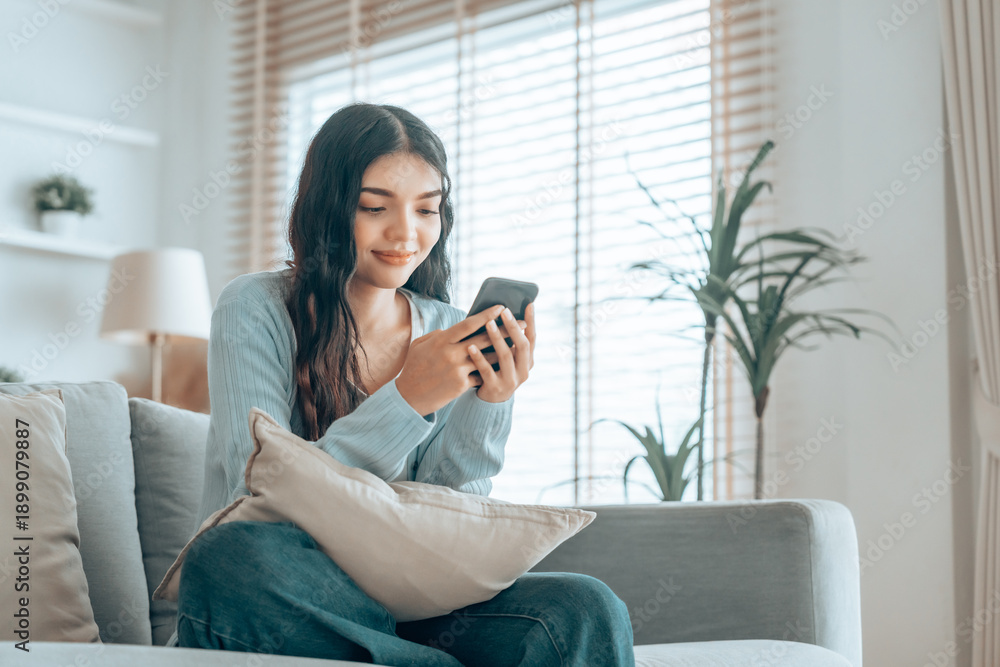 Smiling pretty young Asian woman sitting on cozy couch, using funny mobile apps in living room. Woman at Home, Doing Online Shopping, Messaging Friends, Posting on Social Media #1899079887