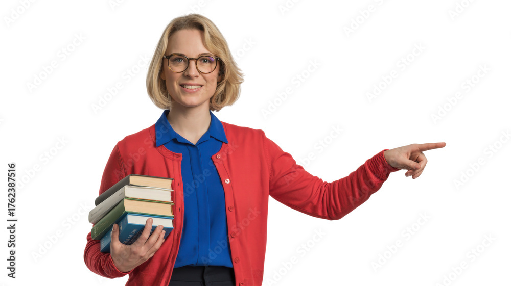 Smiling Professor Pointing: Knowledgeable Teacher Holding Books with Inspiring Gesture #1762387516
