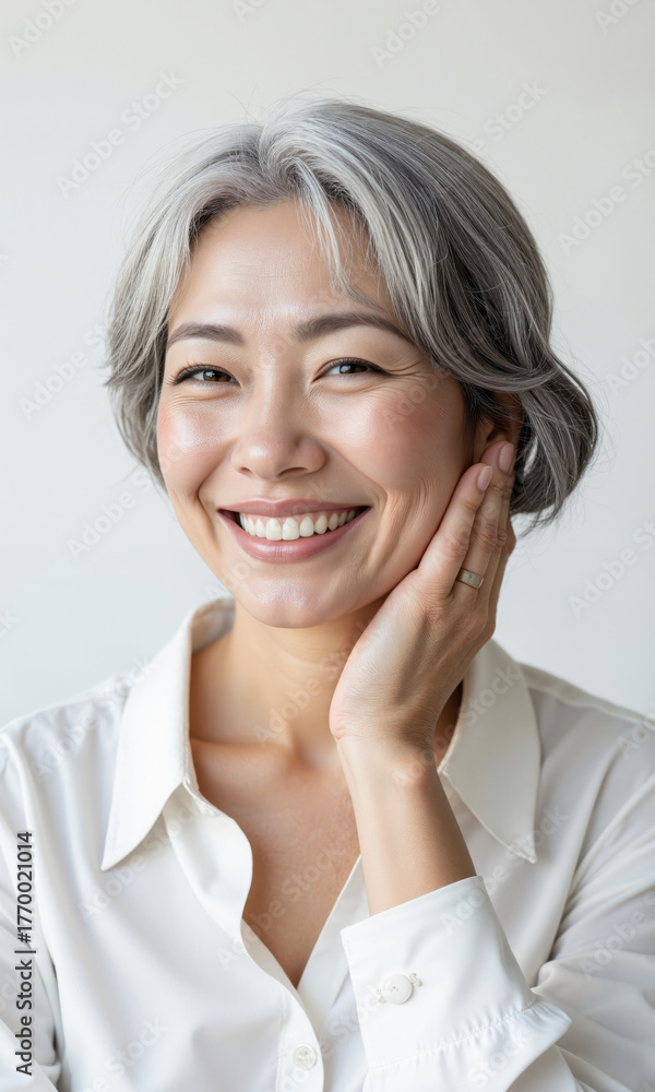 Smiling Senior Asian Woman Hand On Chin Portrait Isolated A medium close-up photo shows a smiling senior Asian woman with #1770021014