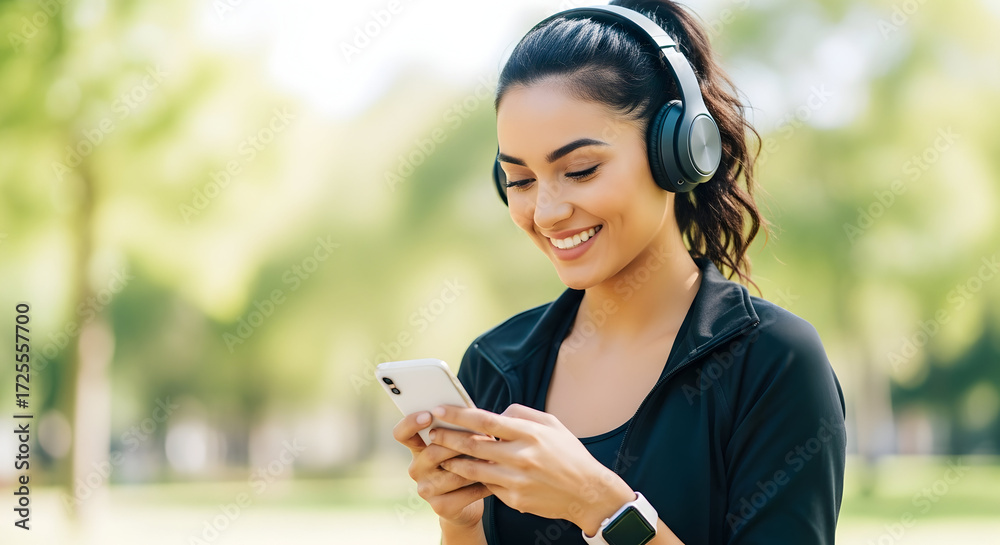 Smiling woman in park using smartphone and headphones enjoying music fitness active lifestyle technology wellbeing healthy habits summer day outdoor workout #1725557700