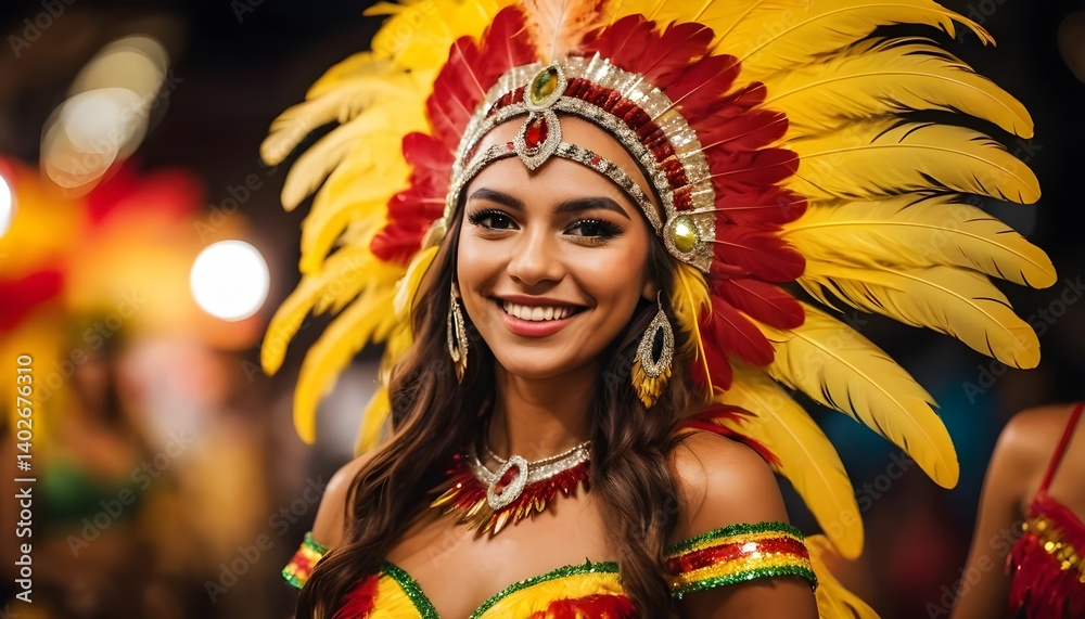 Smiling Woman in Vibrant Carnival Headdress #1402676310