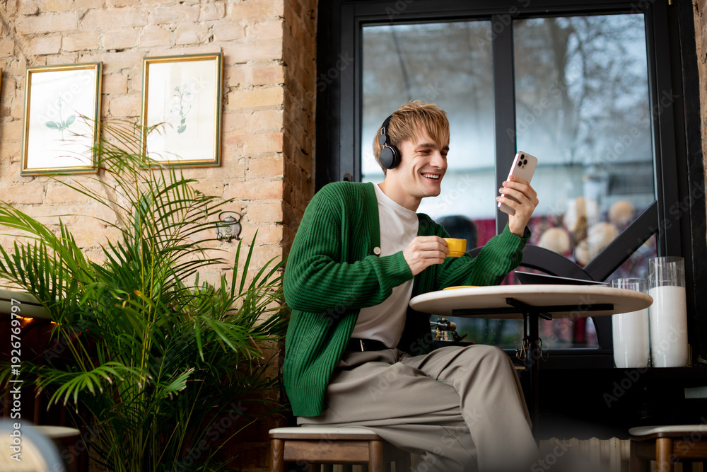 Smiling young man enjoying coffee and music in a trendy cafe setting #1926769797