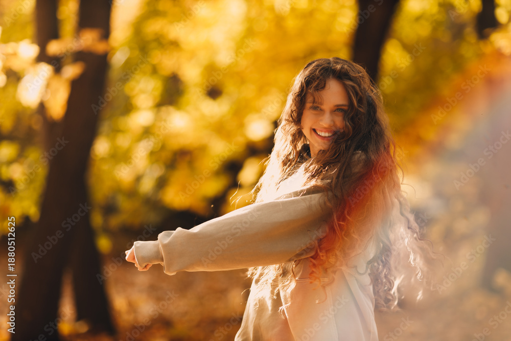 Smiling young woman enjoying the autumn season in the fall park with the yellow leaves at sunset #1880512625