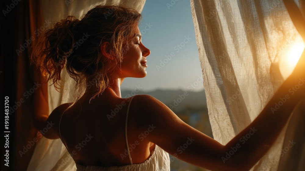 Smiling young woman opens flowing curtains to embrace the glorious golden morning sunlight and fresh air at a peaceful window overlooking a beautiful serene view #1918483700