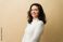 Smiling young woman posing in studio, expressing happiness and carefree casual lifestyle on #1915856929
