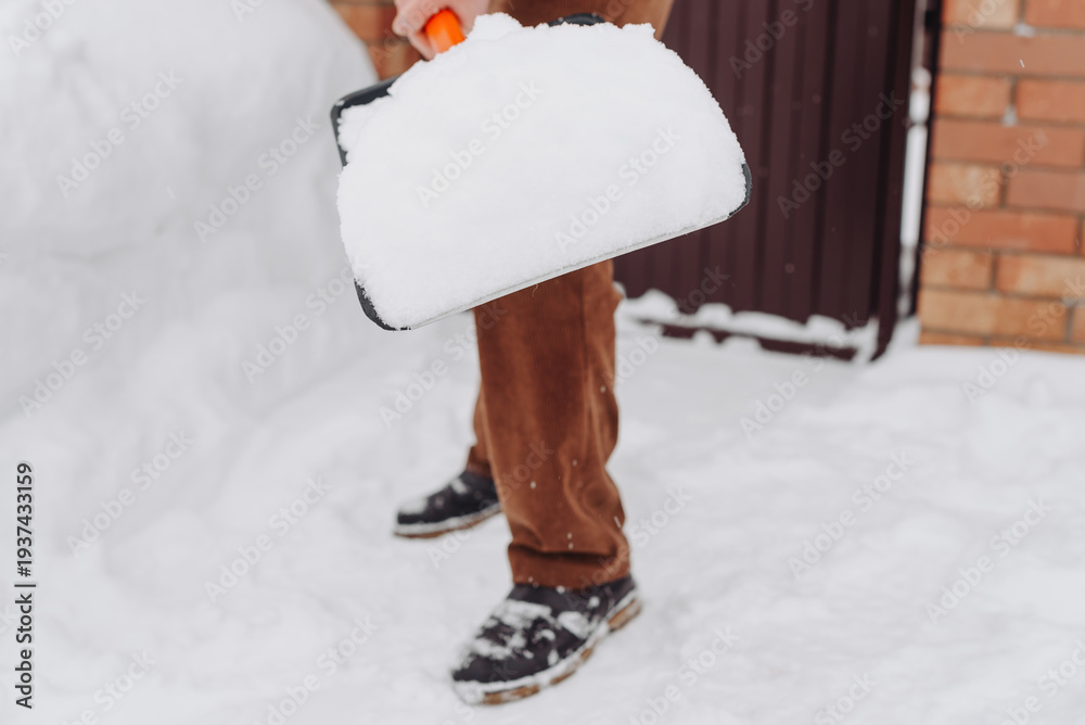 snow shovel in hands, young man cleans territory of snow, courtyard, path, garden, beige trousers, black and orange shovel, snowfall, atmospheric precipitation, bad weather conditions #1937433159