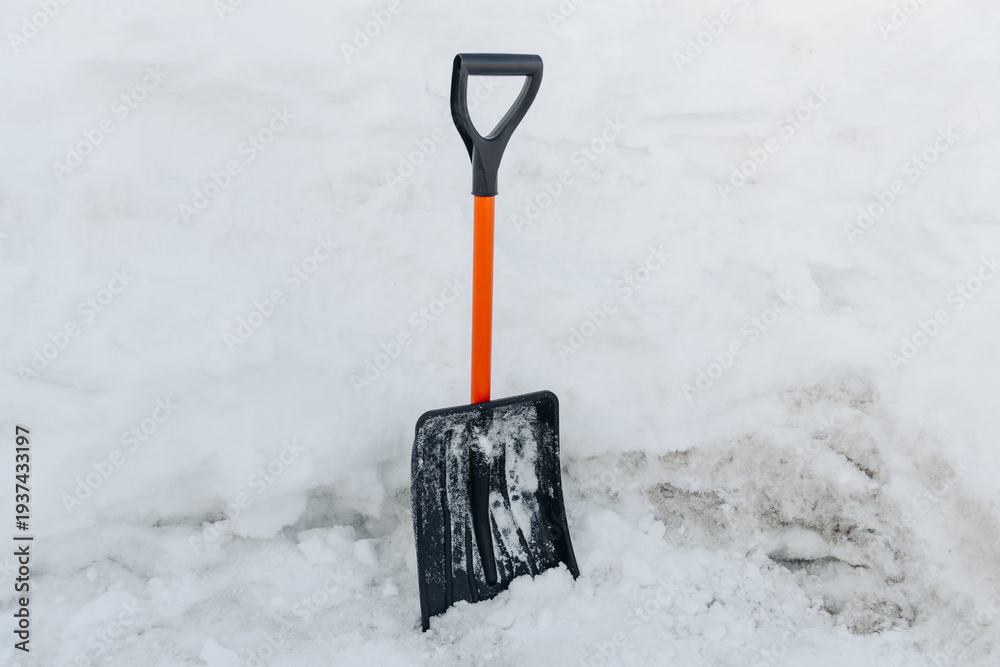 snow shovel in snow, cleaning territory of snow, courtyard, path, garden, black and orange shovel, snowfall, atmospheric precipitation, bad weather conditions #1937433197