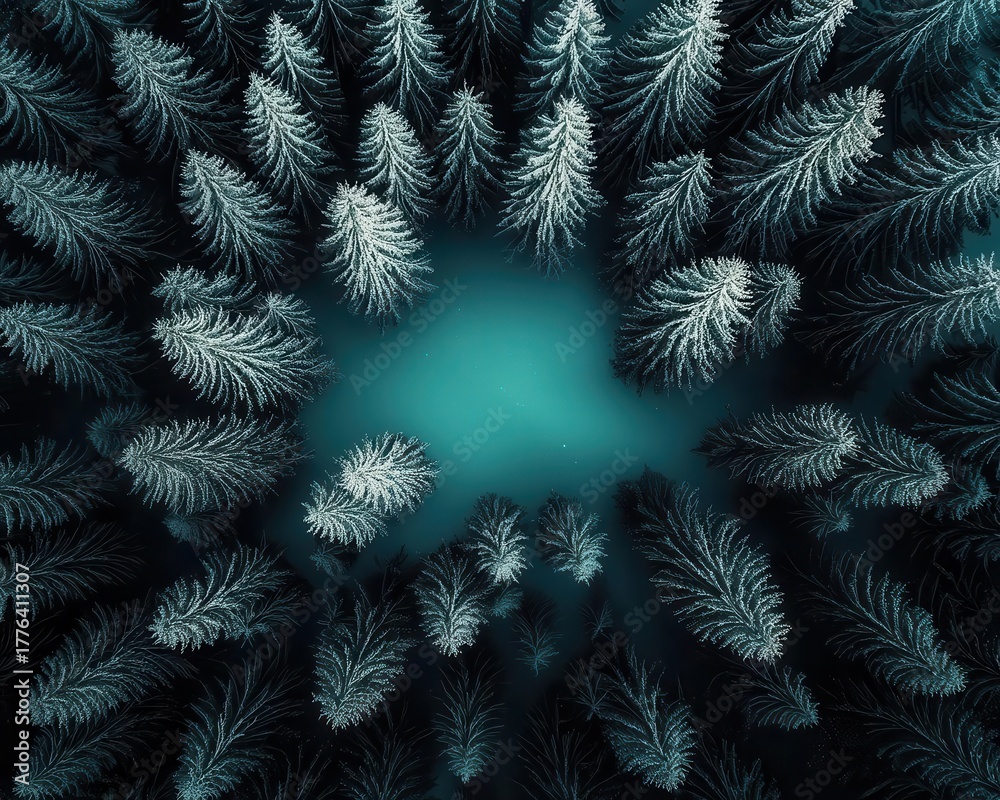 Snowcovered trees lit from above by green aurora, vertical composition #1776411307