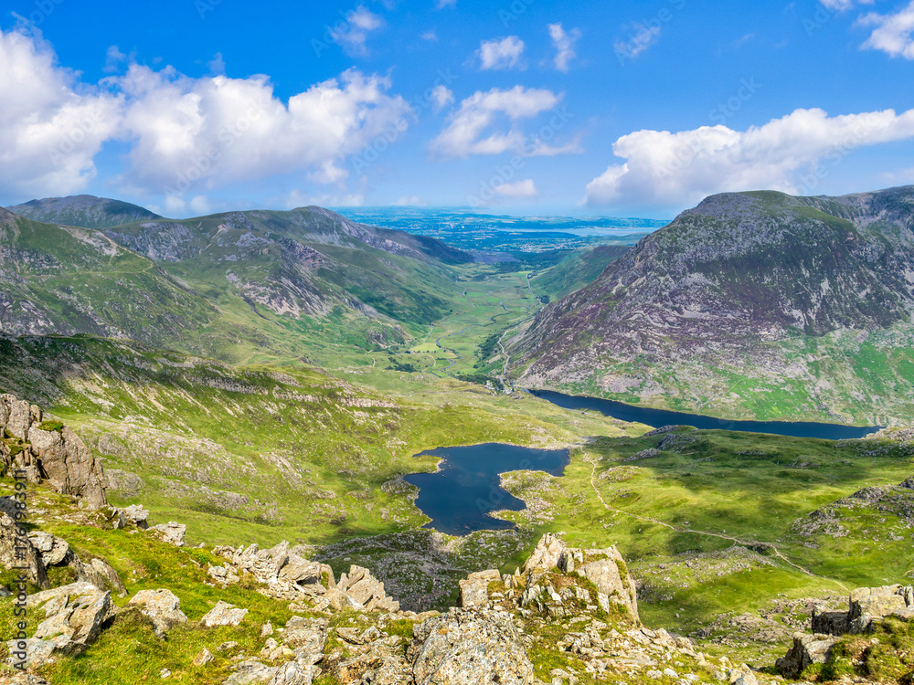 Snowdonia - A view of the National Park in summer from from Bwlch Tryfan, on the walk to the Castle of the Winds, with Nant Ffrancon, Llyn Ogwen, Pen yr Ole Wen, Bwlch Tryfan, LLyn Bochlwyd. #1761983911