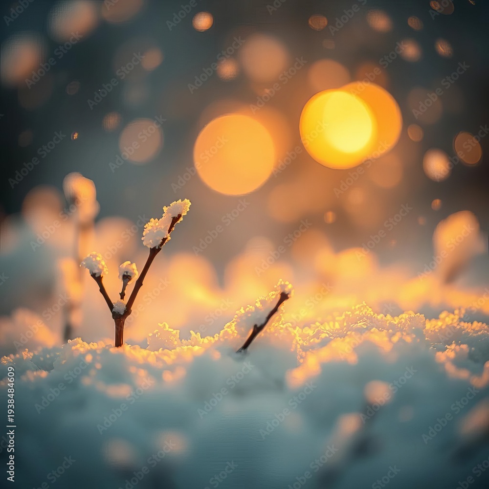 Snowfall's gentle kiss captured in amber hues, frosted imperfections, snow, faded #1938484609