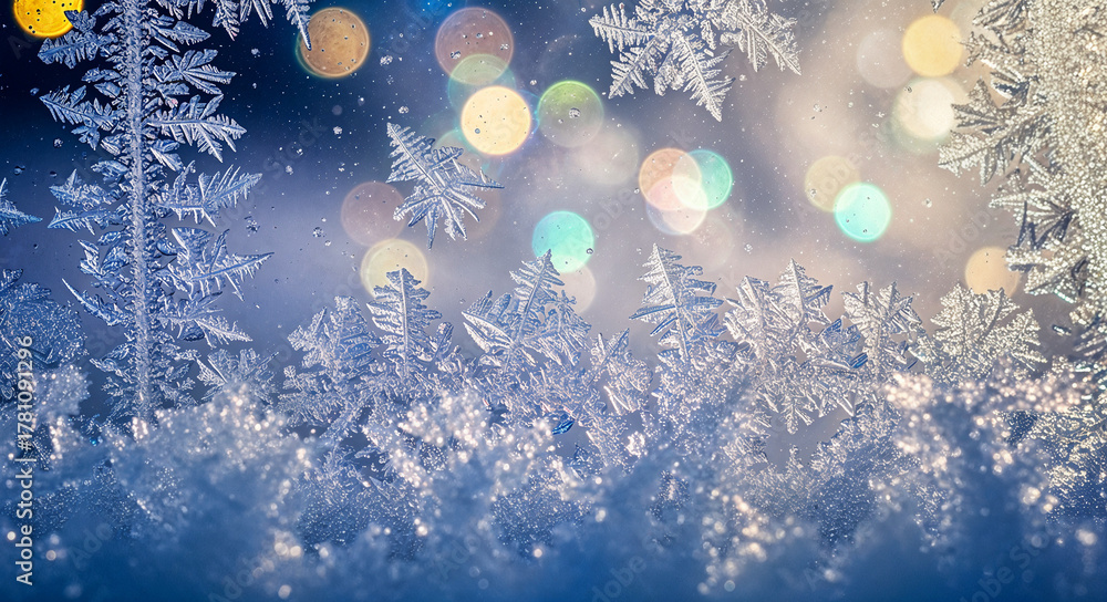 Snowflakes with bokeh lights on blurred winter background #1781091296